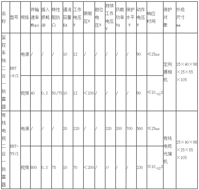 KBT-V2二合一監(jiān)控多功能防雷器采用BNC視頻接口,適用普通攝像機、固定攝像機、紅外機的防雷保護。電源工作電壓分24V(交、直流通用),信號工作電壓為6-12V。