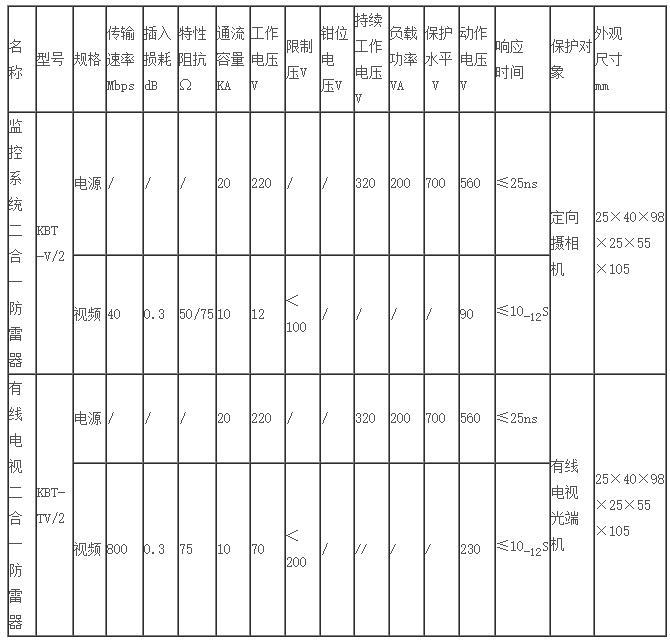KBT-V2二合一監(jiān)控多功能防雷器采用BNC視頻接口,適用普通攝像機(jī)、固定攝像機(jī)、紅外機(jī)的防雷保護(hù)。電源工作電壓分24V(交、直流通用),信號工作電壓為6-12V。